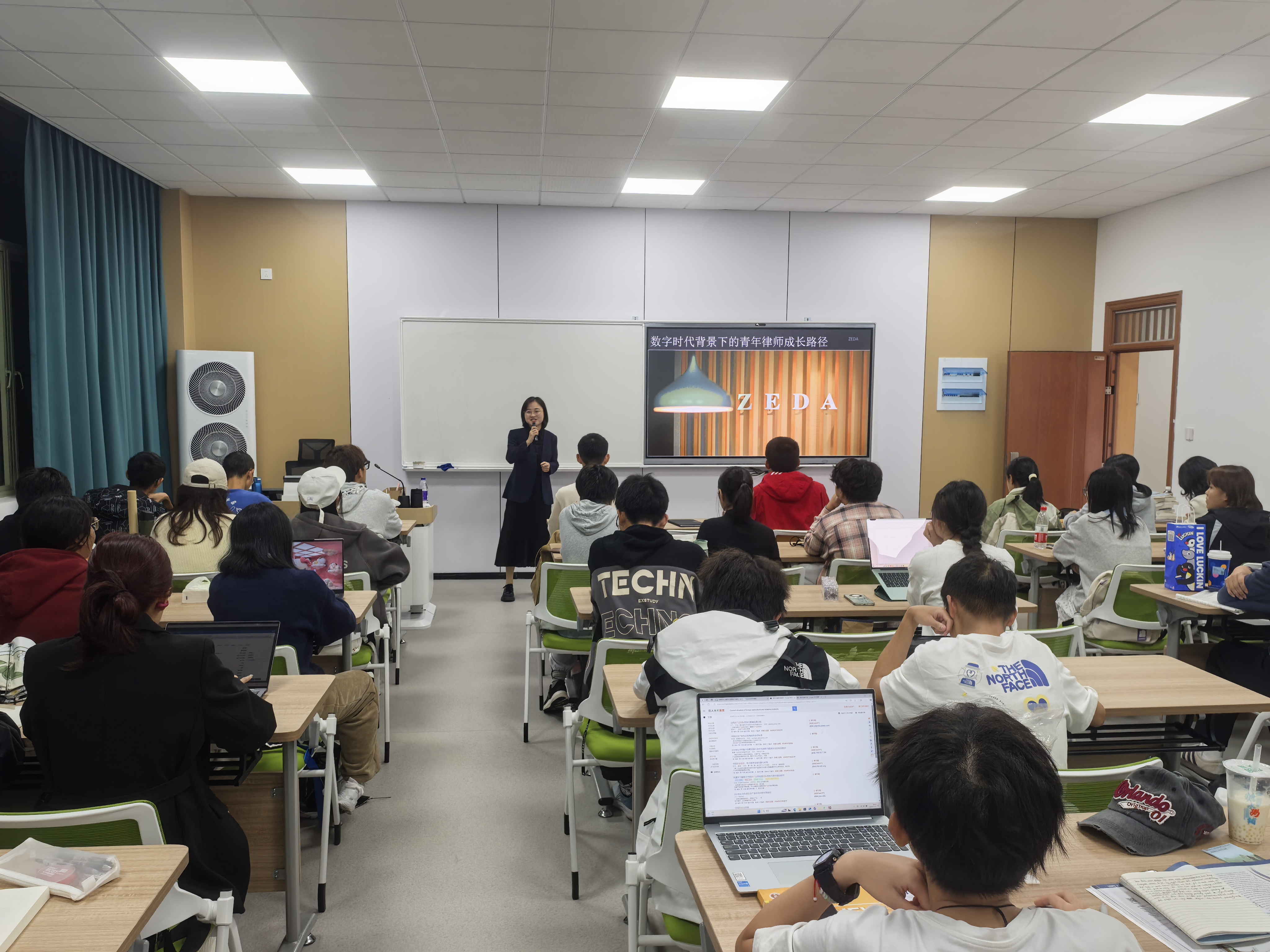 郑律师以“数字时代背景下的青年律师成长路径”为主题,从自身“传统律师的成长路径”为切入口,向同学们讲述了自己作为律师十年来的成长历程。郑律师表示,自己从律师助理到独立律师再到后来的律所合伙人,正是因为其能够“耐得住寂寞”,“学得进知识”,“拓得宽视野”,“担得起责任”,才能最终成长为一名独当一面的合格律师,并鼓励同学们也能发扬这样的精神。随后郑律师介绍了新时代背景下传统律师已难以适应数字化发展的需要,部分传统法律事务将逐渐被人工智能取代,并就此指出——新时代所需要的是能够熟练使用数字化工具,并具有更强法律分析和思维能力的律师。传统的法律知识已很难满足新时代需求,唯有法学与数字技术的结合才能更好地适应时代发展,才能在人工智能席卷各行各业的浪潮中站得住自己的脚步。