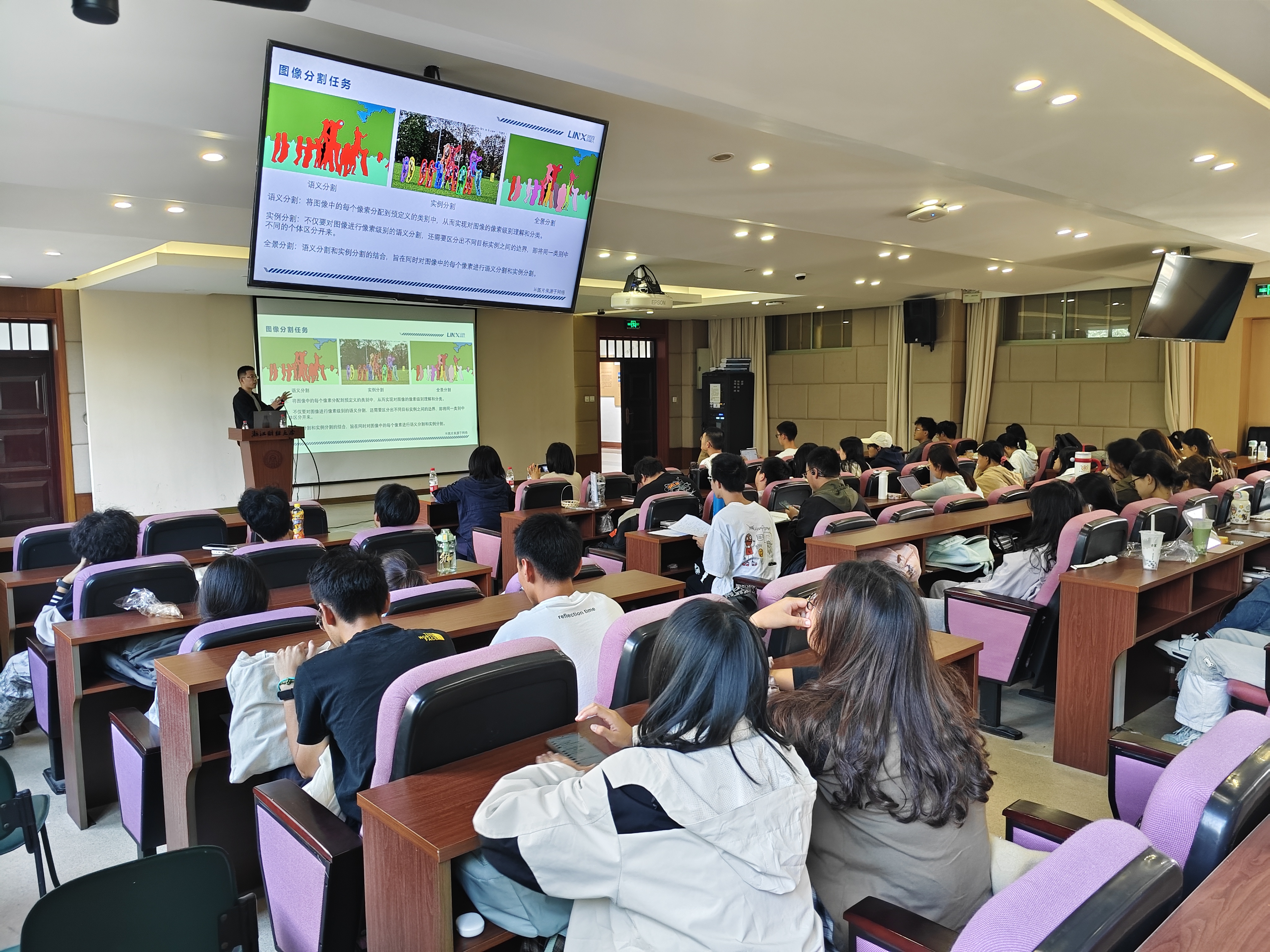 讲座伊始,陈总就“什么是智能标注”为切入点,生动具体地向同学们介绍了智能标注的含义,并进一步推荐了涉及相关知识平台,再通过“语义分割”,“实例分割”等图像分割方式对智能标注进行细致化讲解,极大地引发了同学们对智能标注的好奇和兴趣。