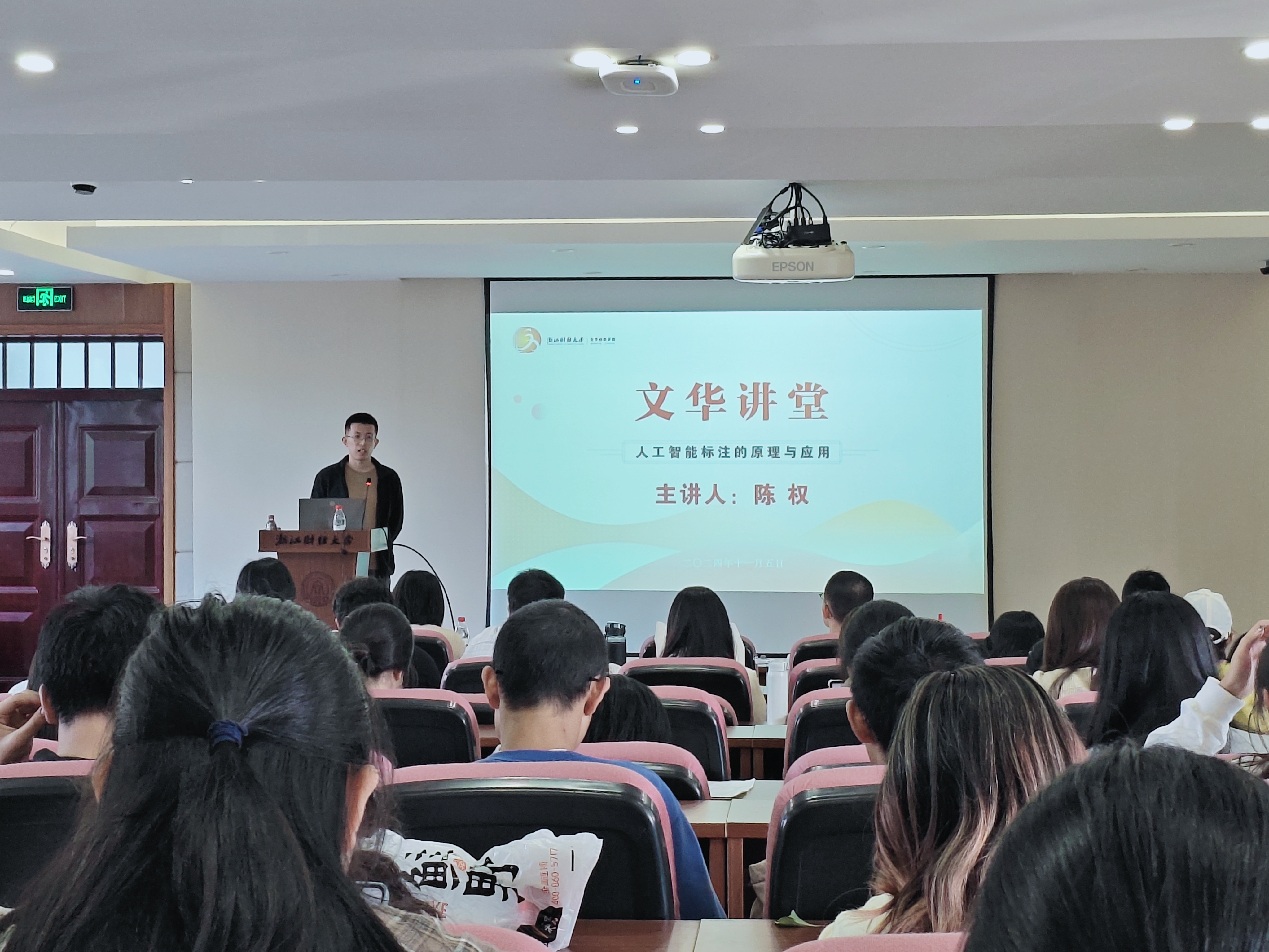 诚挚邀请了灵西机器人深度学习技术主管陈权作“人工智能标注的原理与应用”专题讲座,一百余名文华学子参加活动。讲座由国产传媒