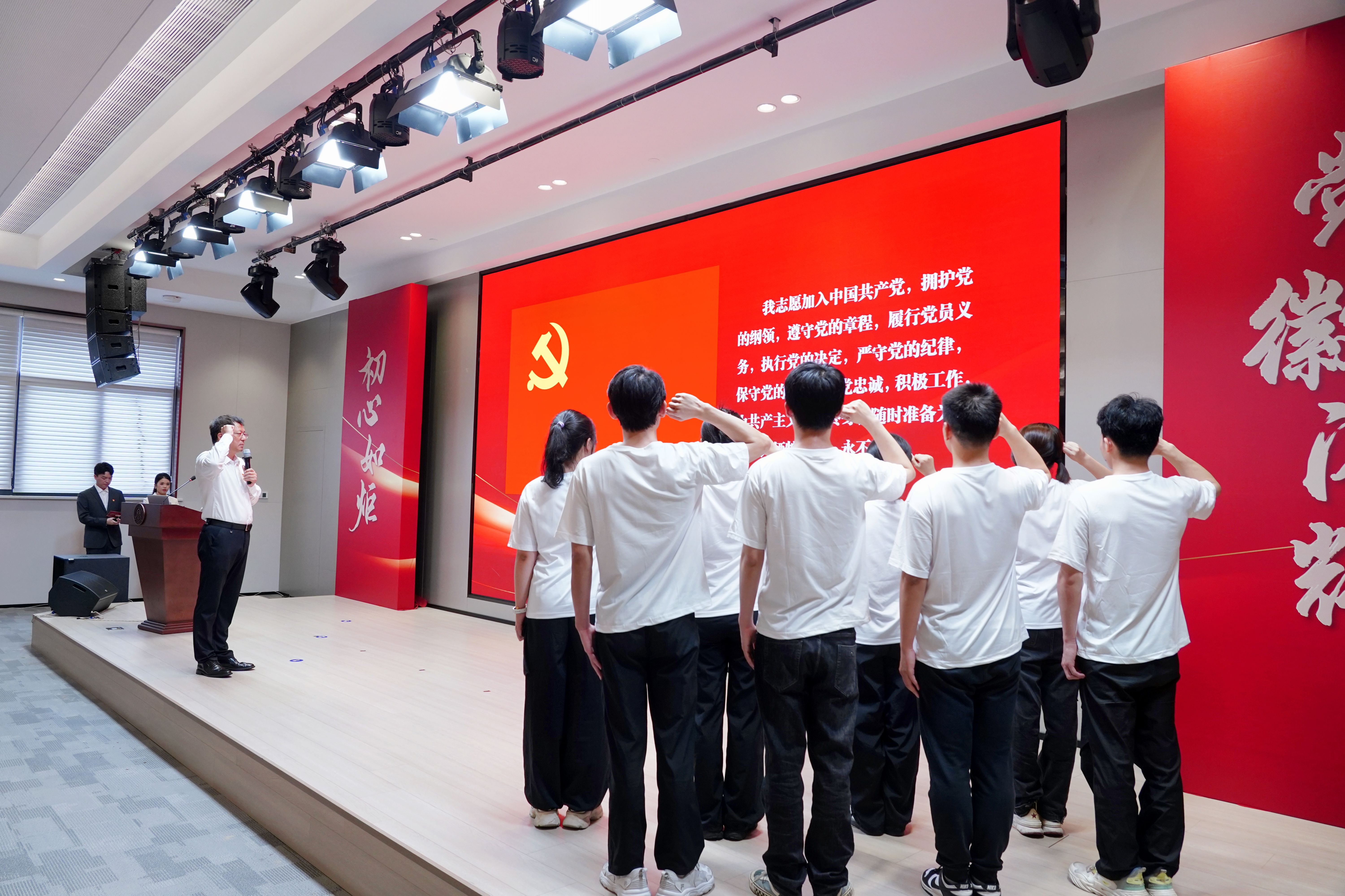 在魏江的带领下,全场师生党员起立,集体宣誓,重温入党誓词。