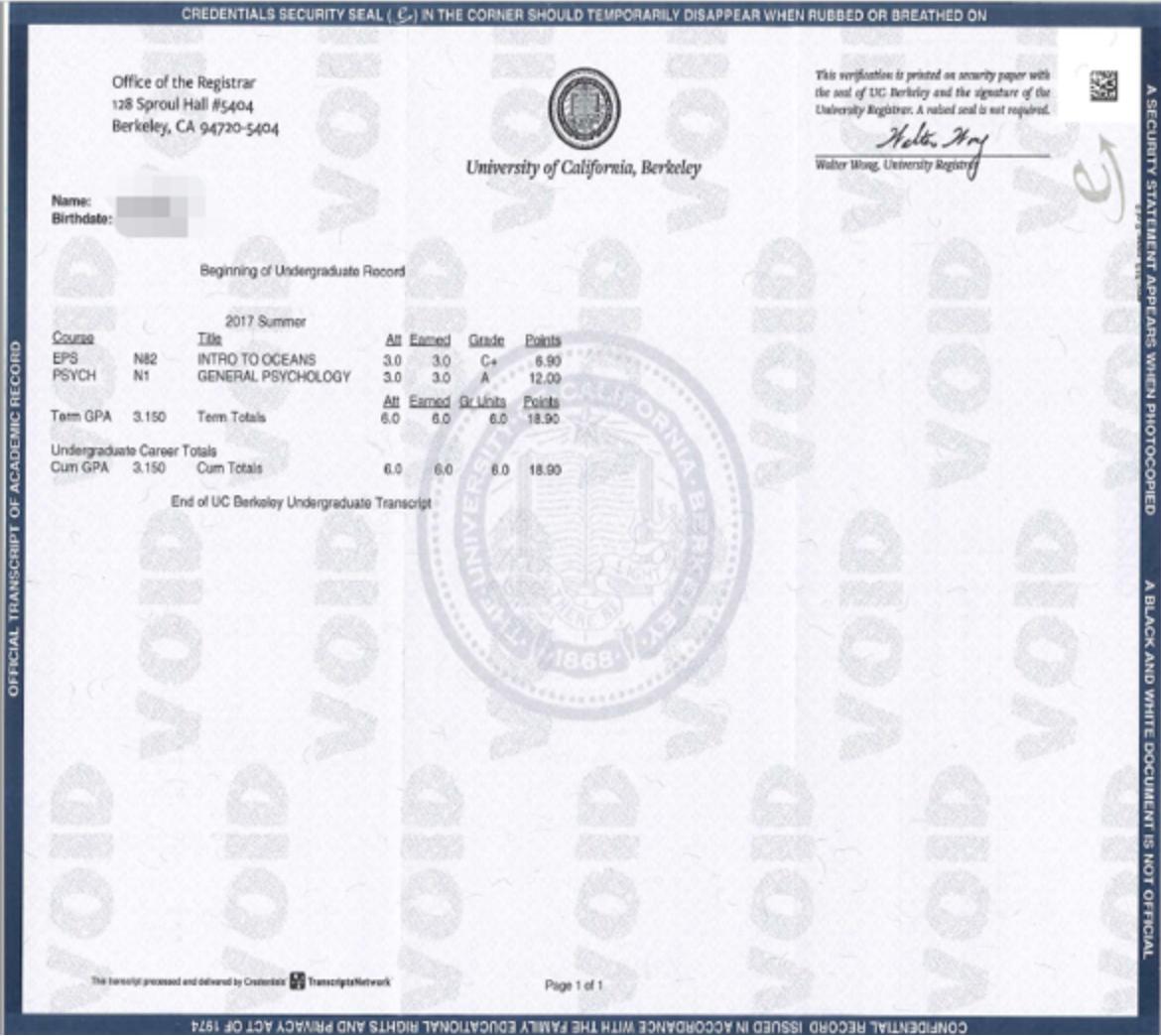 加州大学伯克利分校成绩单样本(仅供参考)