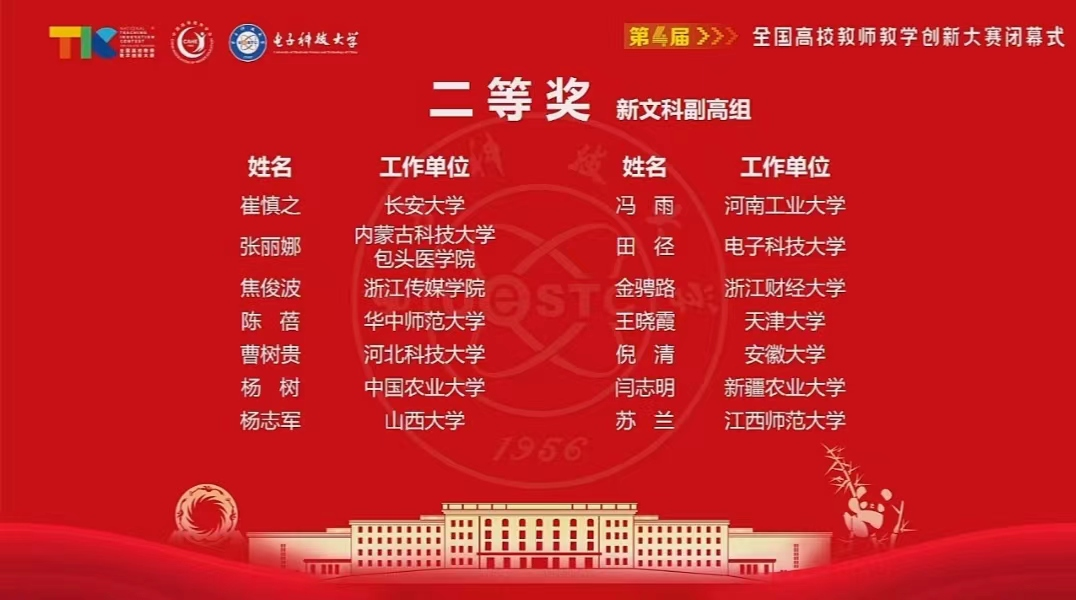 导师金骋路副教授获新文科副高组二等奖。这是我校教师连续三年在此项全国赛事中获奖。