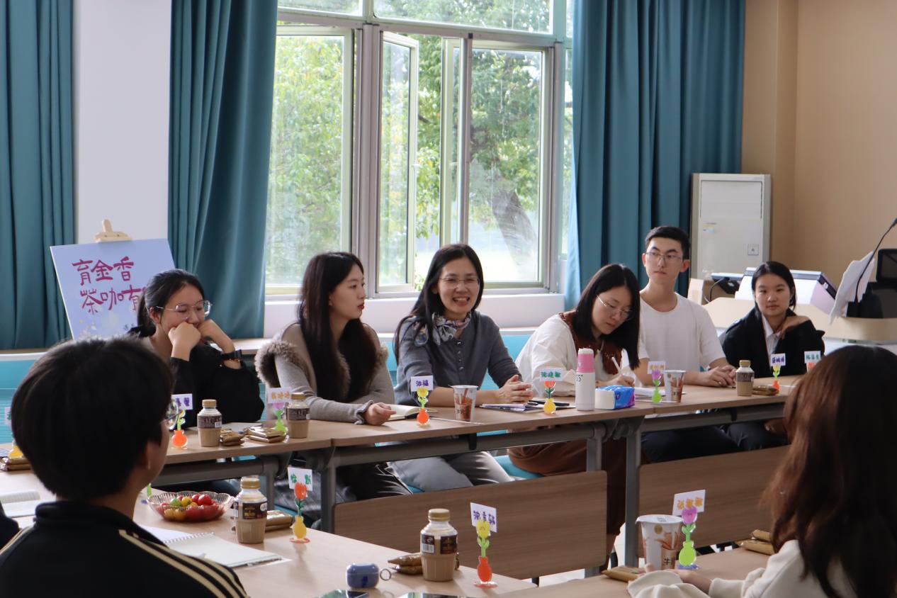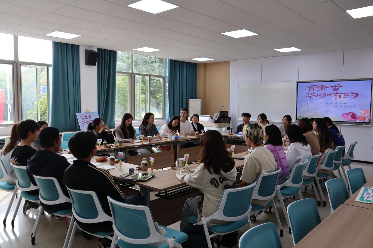 在107教室举办“育金香”茶咖有约活动。学院党委书记沈晓敏、党办主任周衍彤、学办主任池韫在温馨愉快的氛围中与20位2024级新生代表品茶饮、话发展。